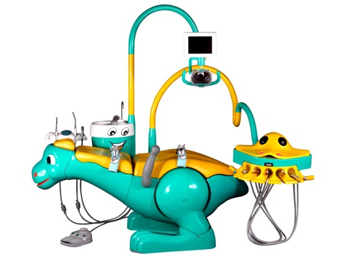 Кресло пациента в стоматологической установке Yoboshi A 800 выполнено в виде стильного и красивого динозавра. Во время процедуры ребенок с большим удовольствием устраивается на спине яркого, симпатичного динозаврика, чем в строгом классическом варианте кресла. В числе особенностей данной модели анатомической конфигурации: